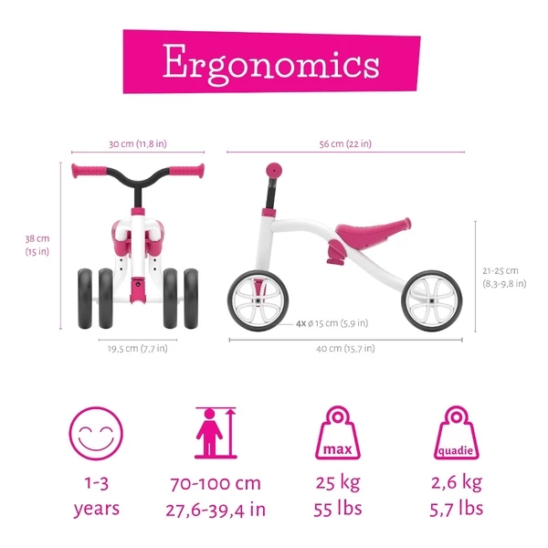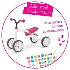 Kids zijn dol op verkennen, dus waarom neem je het avontuur niet mee naar huis? Met de Quadie loopfiets ontdekken ze net weer even iets meer van de wereld om zich heen. Deze loopfiets heeft vier wielen voor stabiliteit, een verstelbaar zadel, handig handvat en ruimte onder het zadel om wat lekkers mee te nemen. Willen de kids de loopfiets laten opvallen? Met de stickers beplakken ze ‘m helemaal naar eigen smaak.