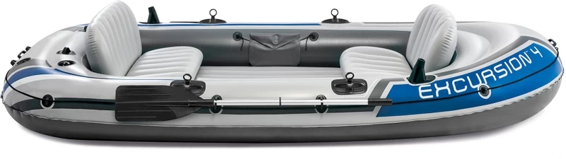 De Intex Excursion 4 is geschikt voor vier volwassenen met een maximale belasting van 400 kilogram. De Intex Excursion 4 is uitgerust met twee quick-fill/fast-deflate ventielen voor het eenvoudig en snel opblazen/leeglaten. Verder heeft de Intex Excursion 4 Set een I-balk bodem, die zorgt voor extra comfort en stabiliteit. Ook handvatten en riemsloten zijn uiteraard voorzien. De Intex Excursion 4 weegt 22 kilogram.